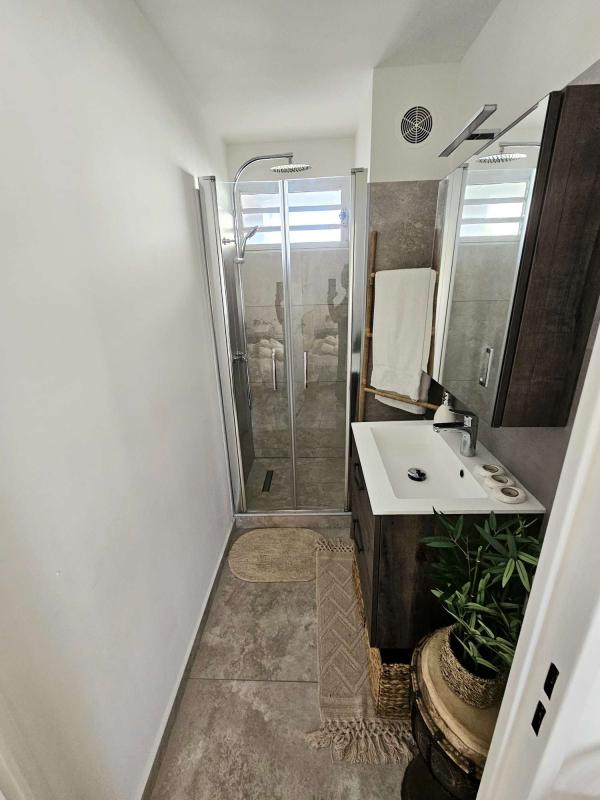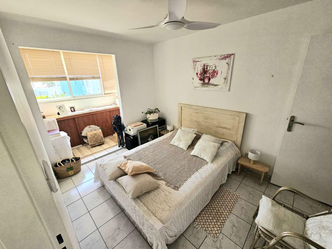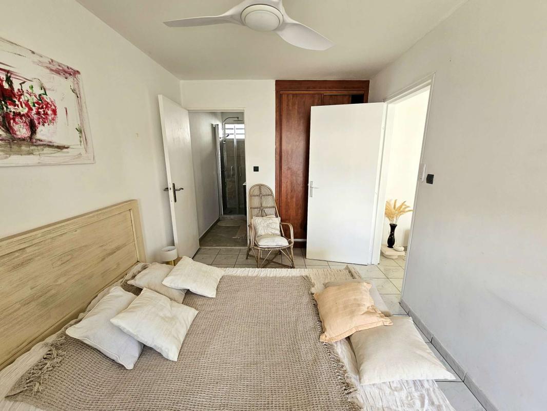 De l'autre côté de l'appartement, un dégagement distribue les 2 chambres : Une première avec placard par laquelle on peut rejoindre la varangue fermée et la 2e chambre climatisée qui donne quant à elle entièrement vers la mer et la vue magnifique. Une très belle salle de bain entièrement rénovée et un WC séparé.