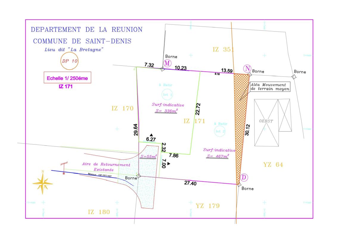 Emplacement : La Bretagne Chemin des CrotonsSuperficie : 336 m2 Zone entièrement constructibleÉquipements : mur de soutènement réalisé, réseaux à proximitéAtouts : impasse, calme, vue mer & montagne