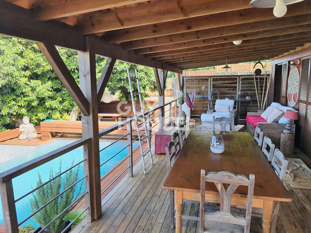 Au premier niveau, un grand salon, une cuisine équipée, un bureau, le tout donnant sur une belle terrasse qui surplombe la piscine à débordement.