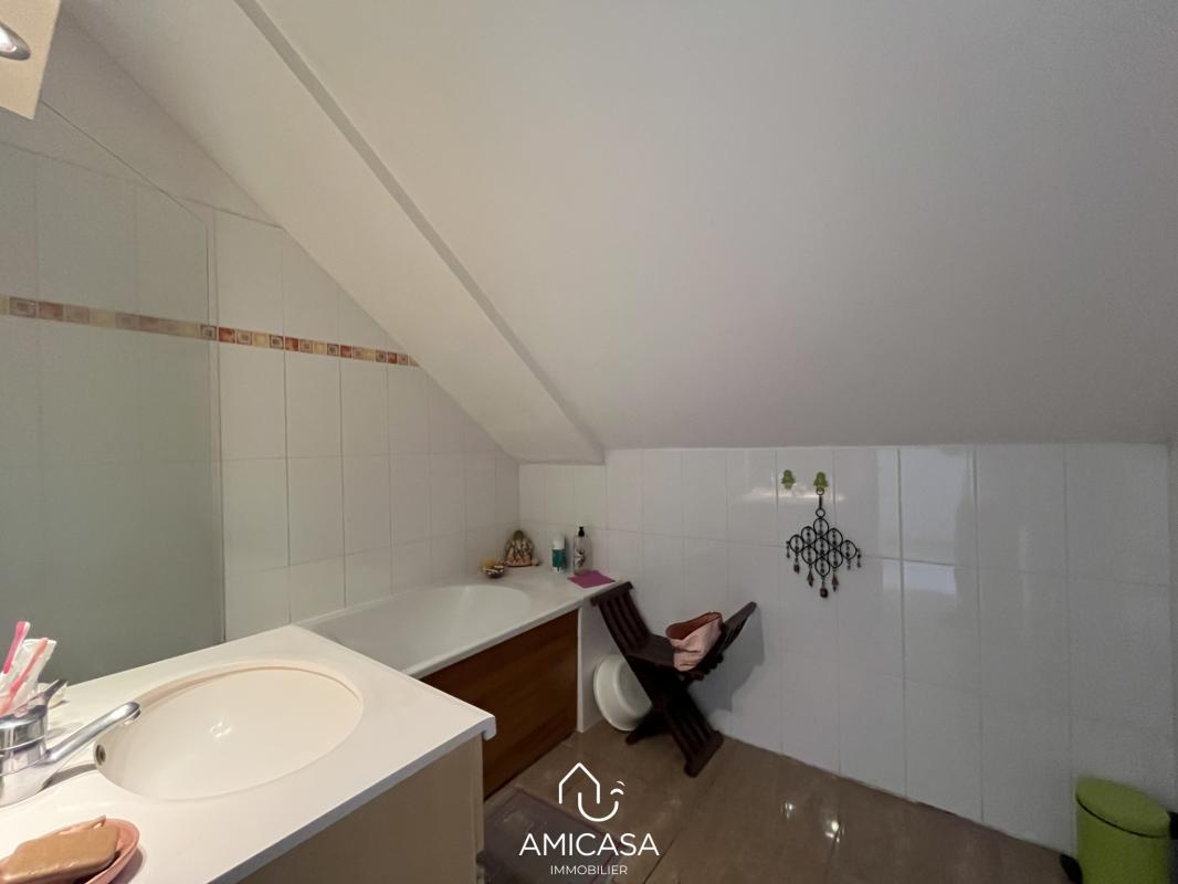 A l'étage : 2 belles chambres (sous combles), un deuxième WC, une salle de bain et un couloir.
