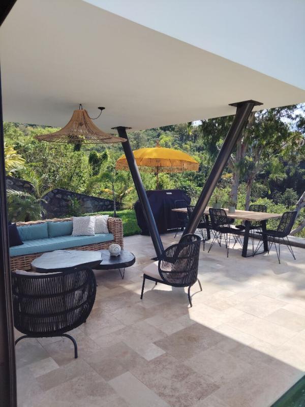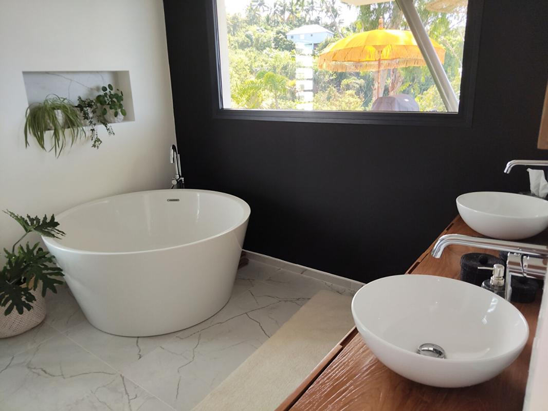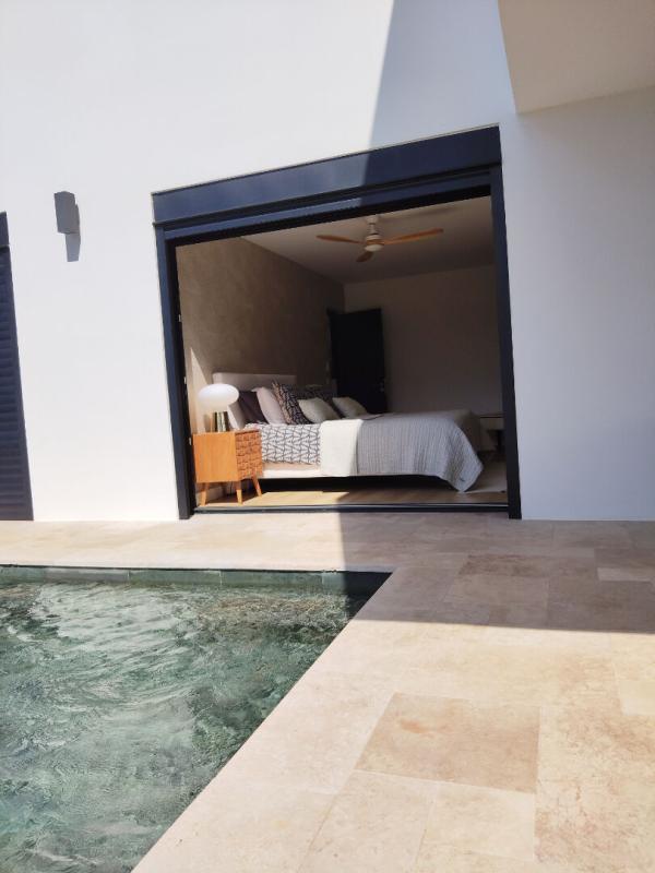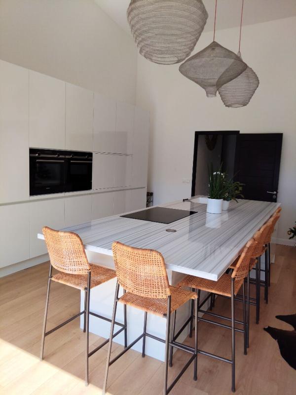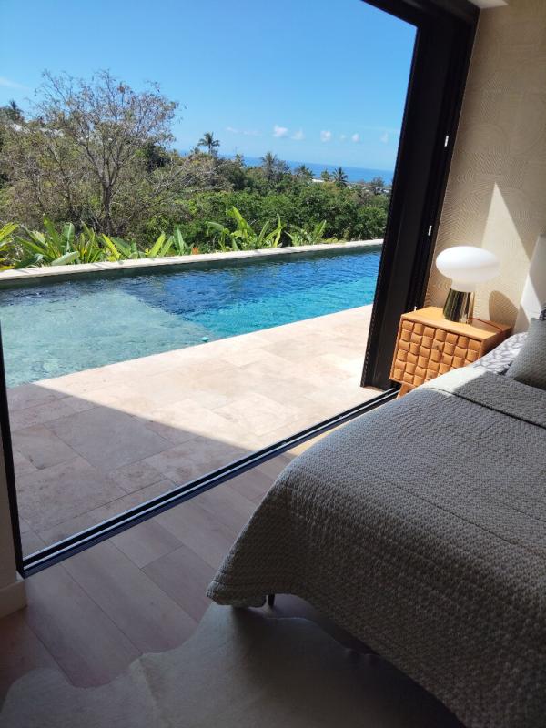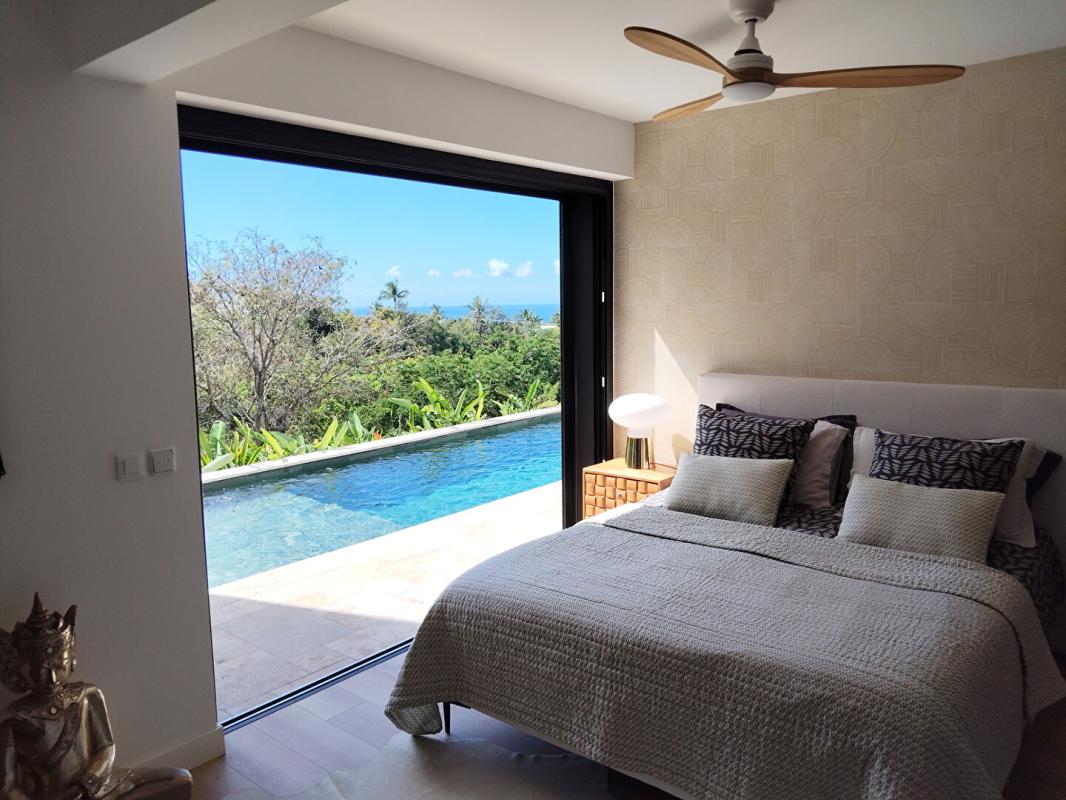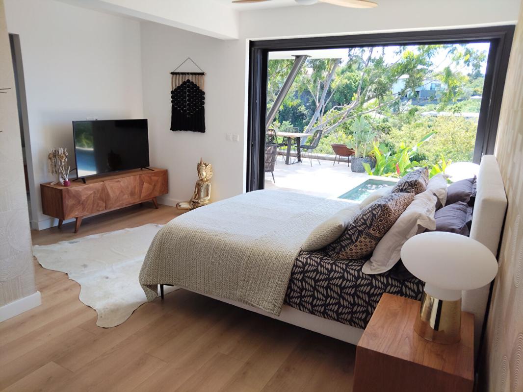 Elle offre un vaste espace séjour/cuisine de plus de 62 m², avec une cuisine haut de gamme entièrement équipée. La pièce de vie principale est ouverte et prolongée par de grandes baies vitrées à galandage donnant sur une magnifique terrasse, elle-même bordée d'une piscine en pierre de type balinais de 3 m × 11 m.