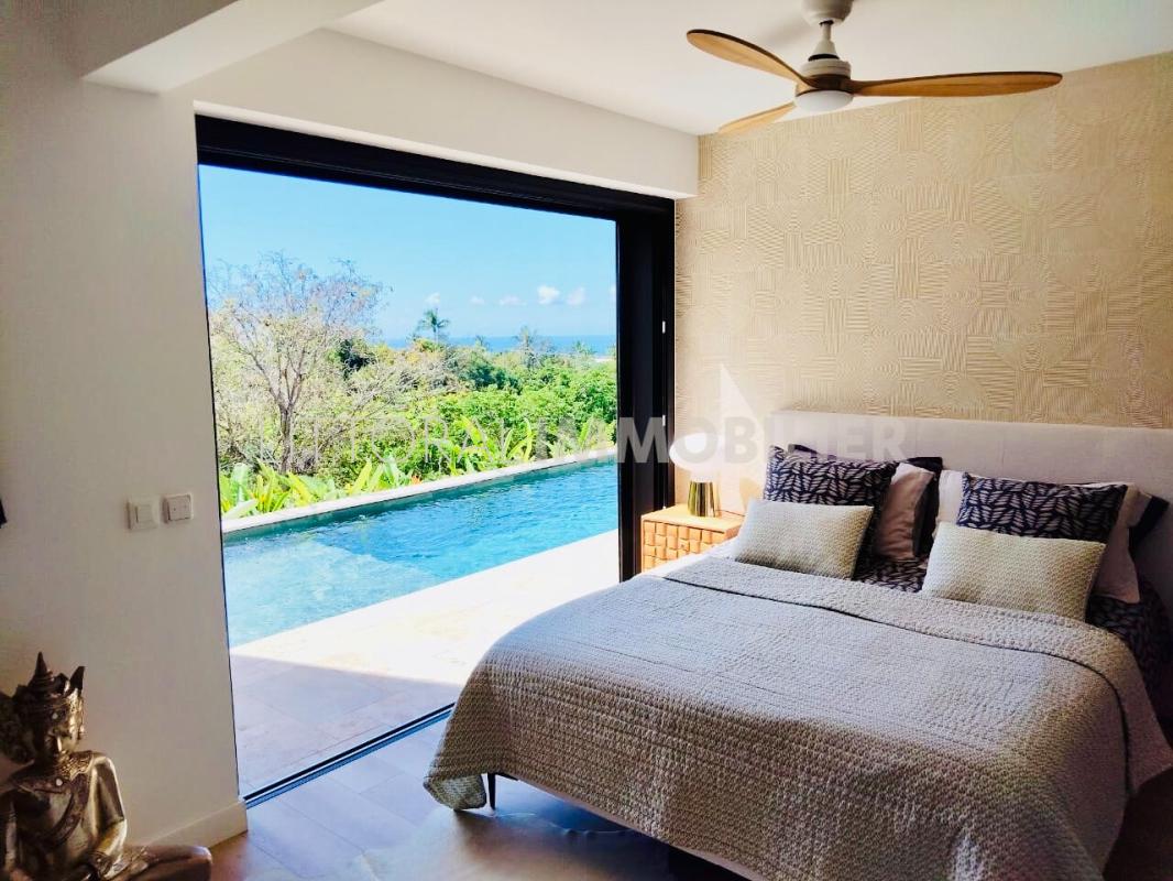 Au niveau R+1 : une varangue de 42 m² avec vue mer et montagne, une cuisine ouverte sur le salon salle à manger, une chambre, une salle d'eau, un wc et un débarras ainsi qu'une dépendance de type studio.