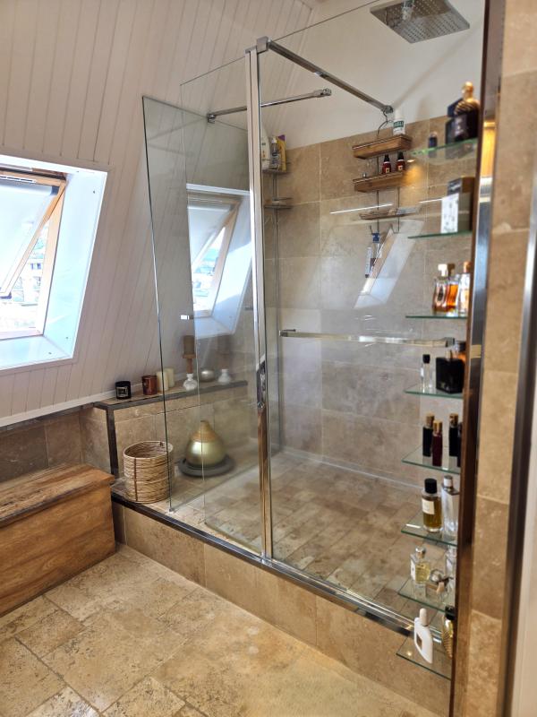 Dès l'entrée : volume cathédrale, lumière, respiration. Puis un espace de vie meublé avec exigence : Roche Bobois, lignes contemporaines, matières nobles, confort immédiat.