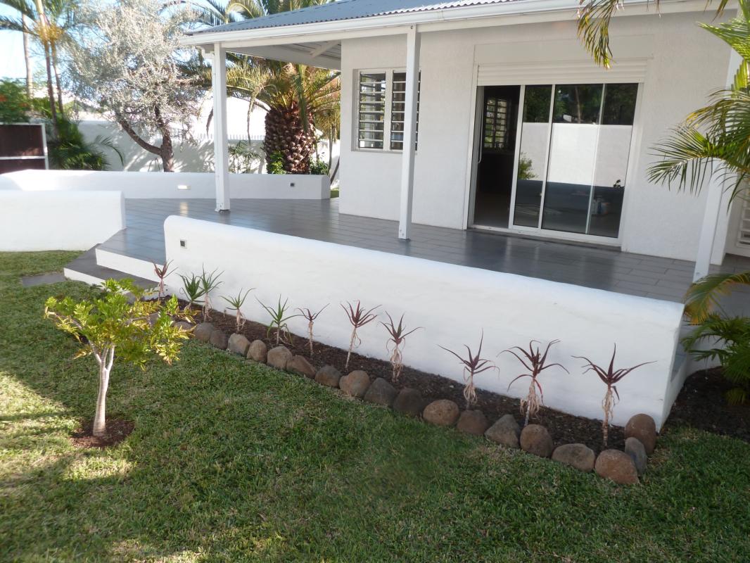À l'extérieur, vous disposerez d'un patio, d'une varangue, d'une terrasse, et d'un jardin clôturé et arboré avec un abri de jardin en dur sous tôle, situé à Bois d'Olive.